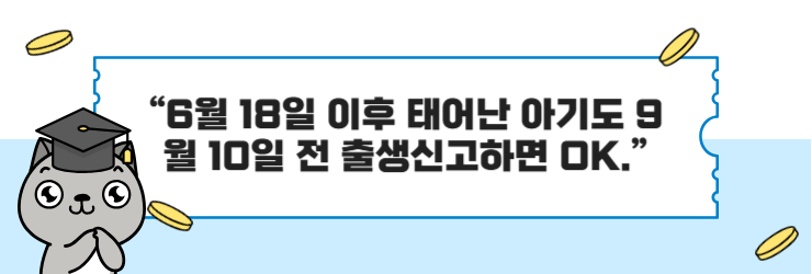 - 6/18 이후 출생 → 9/10까지 출생신고 하면 지급 가능