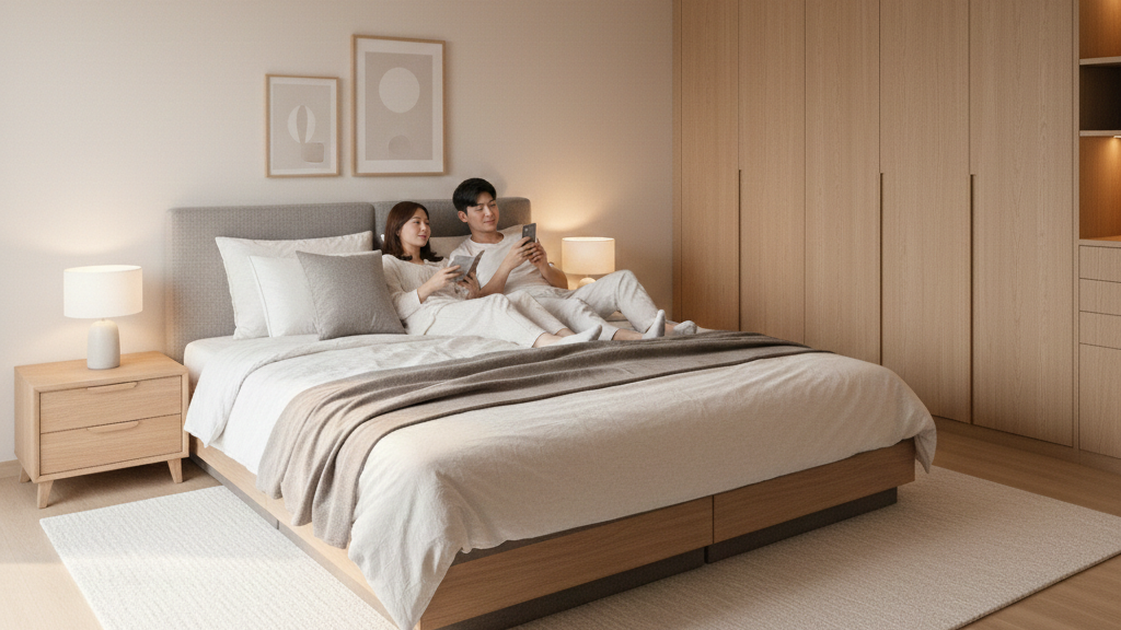 각자 좋아하는 각도에서 독서를 하거나 휴식을 취할 수 있는 트윈 모션베드는 2026년 신혼 가구의 필수 아이템입니다. 일룸의 모션베드는 저소음 설계로 수면 방해를 최소화합니다.